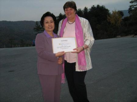 Frau Anneliese Weber überreicht eine Spende aus Deutschland für Frauen und Kinder in Nordkorea.