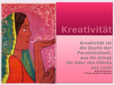 Die bedeutendsten Aspekte im Zusammenhang mit Kreativität sind für mich persönlich Liebe und Leben. Sind wir kreativ, dann fühlen wir uns lebendig, voller Leben und Lebensfreude. Kreativität, der Prozess des Erschaffens schafft Leben. Dazu gehört, dass unsere Kreativität aus unserer Liebe entspringt. Wie oft sind wir kreativ, weil wir einem Menschen, den wir lieben helfen und unterstützen möchten. Dann entspringt die Kreativität aus unserer Liebe und ist plötzlich da, manchmal, ohne dass wir sie bemerken. Dann entsteht aus der Kreativität Leben und Freude.