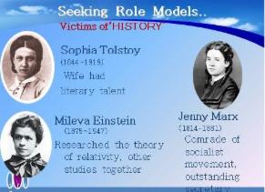 Die erste Frau von Albert Einstein, Mileva Maric, war auch eine heraus-ragende Studentin der Wissenschaft. Als einzige Frau studierte sie am Schweizer Polytechnikum Physik. Sie diente als „Resonanzboden“ für die Forschungen Einsteins, dann heirateten sie, aber der zweite Sohn war krank. Sie konnte ihre Forschungen nicht weiter fortführen und von ihrem Mann hatte sie keine Unterstützung. Er gewann den Nobelpreis für Physik und verliebte sich in seine Cousine, die seine zweite Frau wurde. Mileva verbrachte den Rest ihres unglücklichen Lebens in einem Pflegeheim.